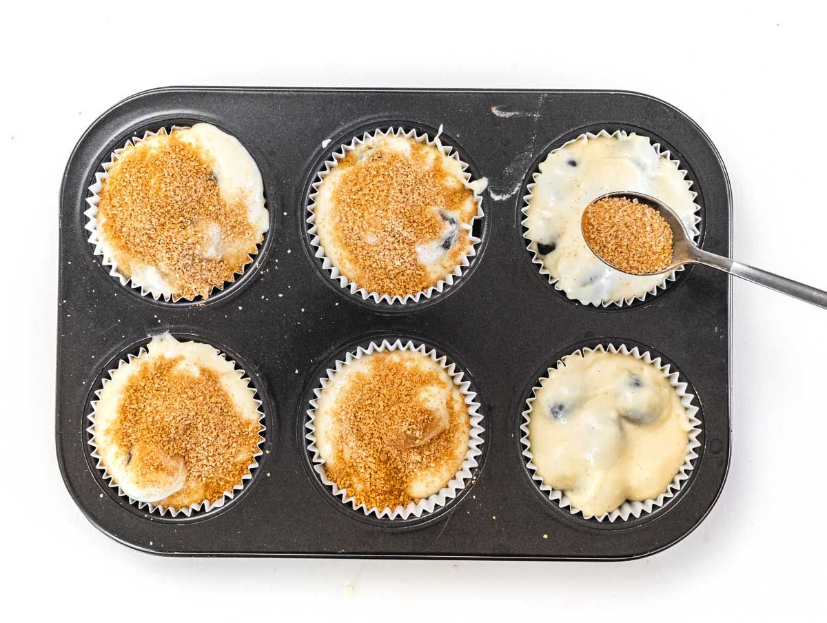 Optionally, sprinkle the top of the muffins with sugar. We used brown sugar here, but white sugar is also ok.