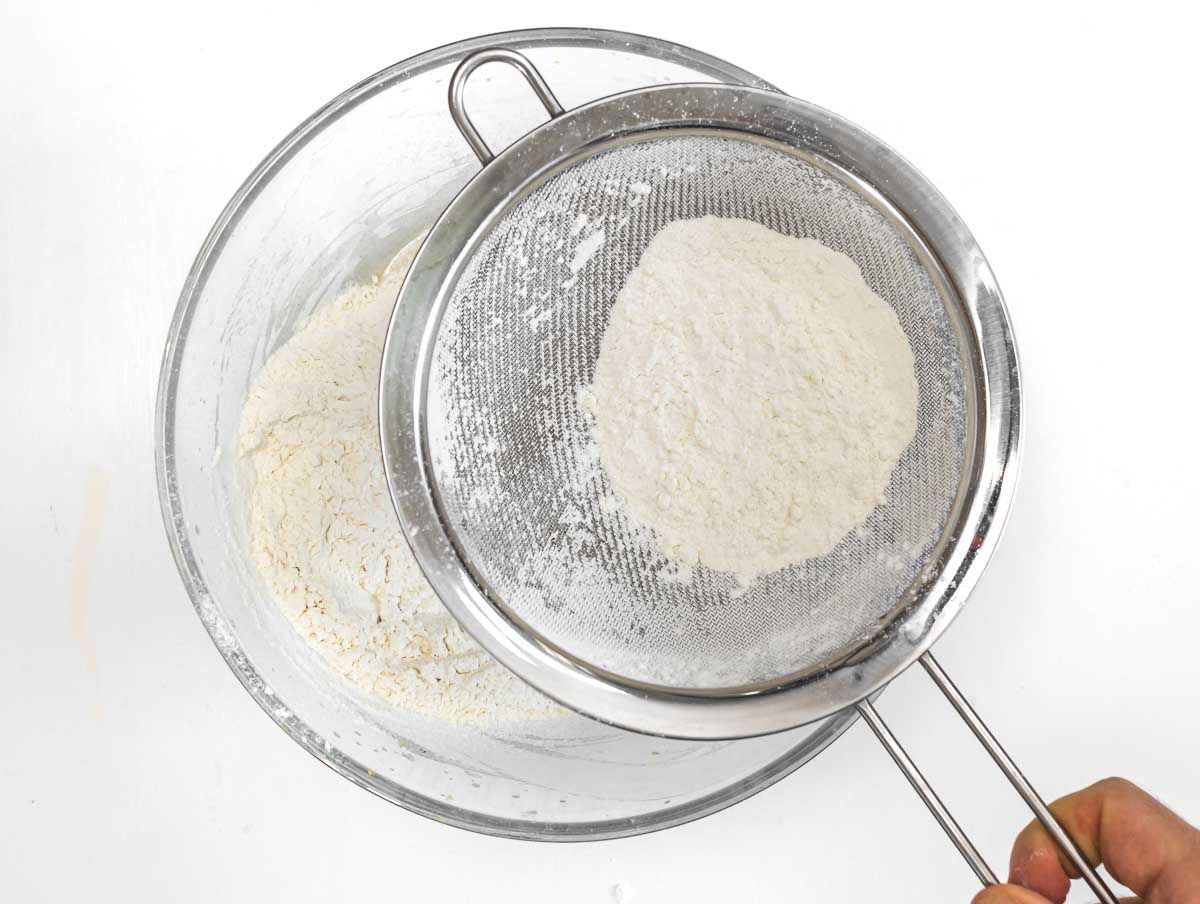 3. Sift in all-purpose flour, baking powder, and salt all at once.