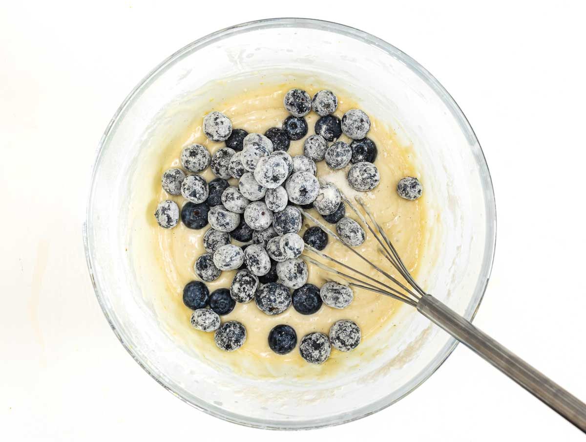5. Rinse the blueberries, shake the water off, toss them in a bowl with the cornstarch, then add them to the batter.