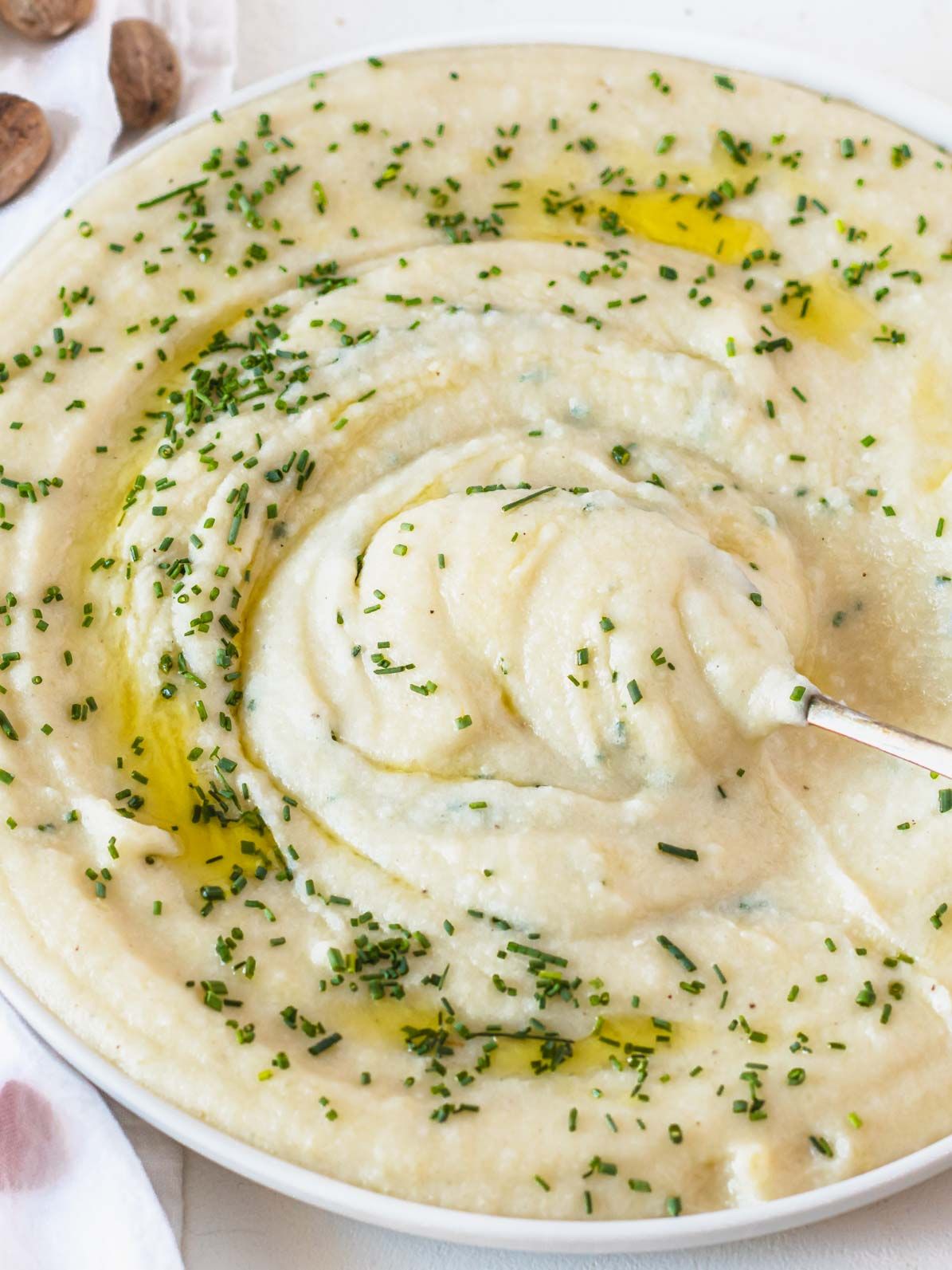 Cauliflower mashed potatoes is a healthier twist on classic mashed potatoes. The recipe is as creamy and delicious as the traditional mash, but cauliflower is swapped for half of the potatoes.
