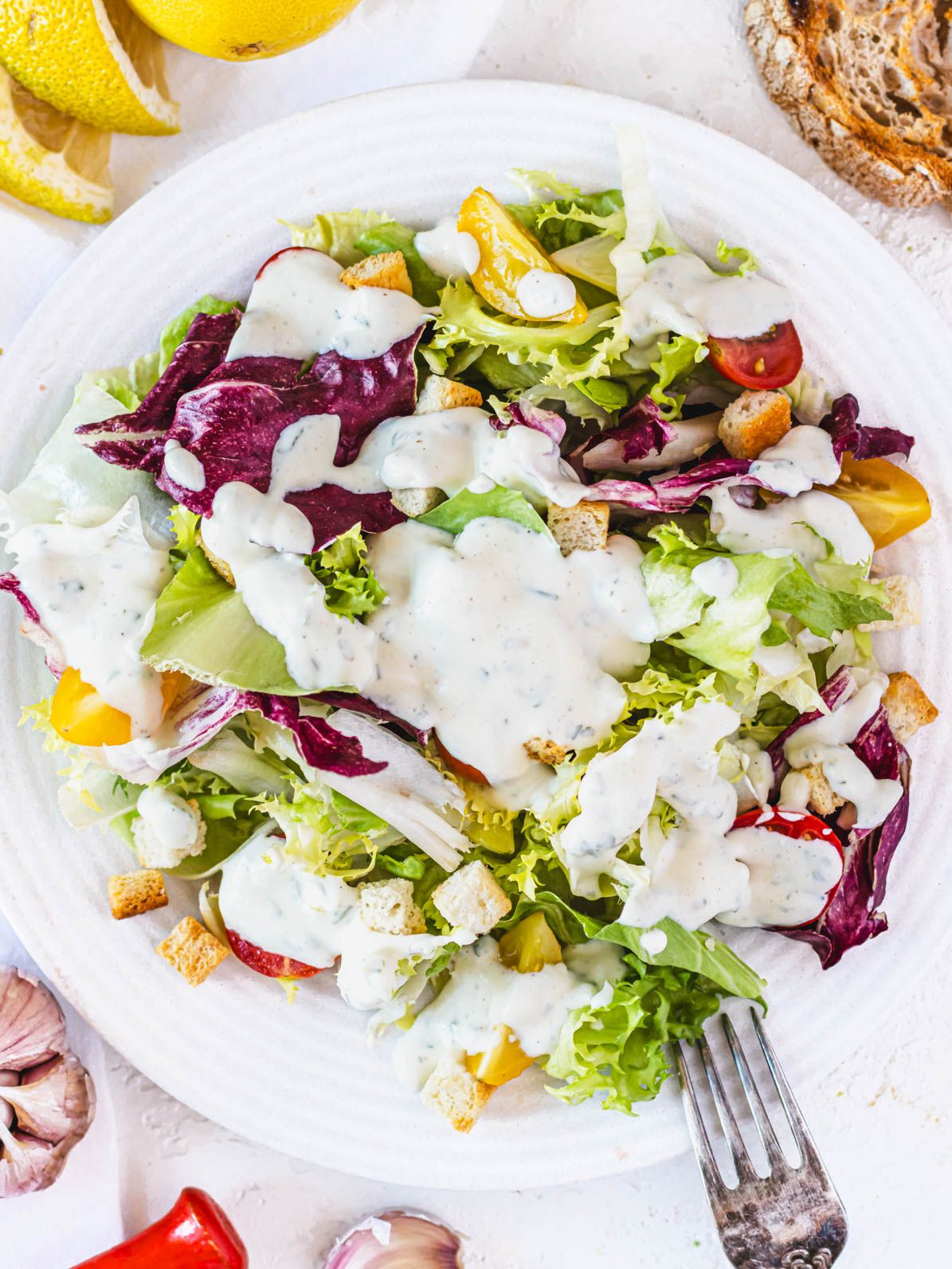 Our vegan ranch dressing is a quick and easy homemade ranch dressing recipe with simple ingredients, such as vegan mayo and non-dairy yogurt.
